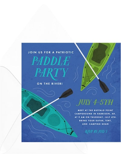 Gather your fellow outdoor enthusiasts with this paddle party invite! Celebrate the Fourth of July holiday with a camping getaway full of kayaking, hiking, and chatting by the campfire.