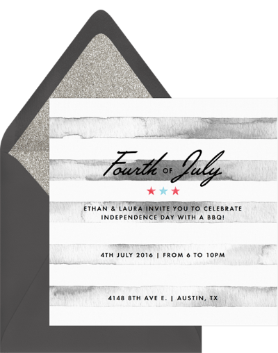 Grab some sparklers and welcome guests to your Fourth of July celebration with this watercolored party invite. The design features thick red, white, and blue stripes and hand-lettered wording, putting a modern spin on tradition. It’s perfect as a casual pool party invitation or for an upscale backyard BBQ.
