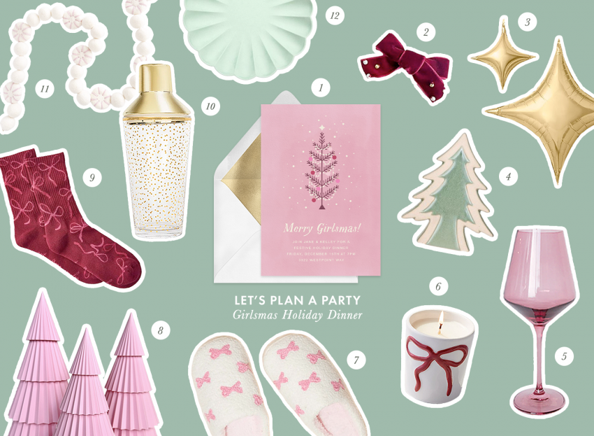 Your Girlsmas dinner party menu should be as delightful as the decor. Serve up small bites like smoked salmon crostini, charcuterie boards, and pink macarons. For the main course, a cozy make-ahead soup or a festive one-pot pasta dish are crowd pleasing low-stress favorites. For another fun spin, opt for a potluck where everyone brings a nostalgic family-favorite holiday dish to share.