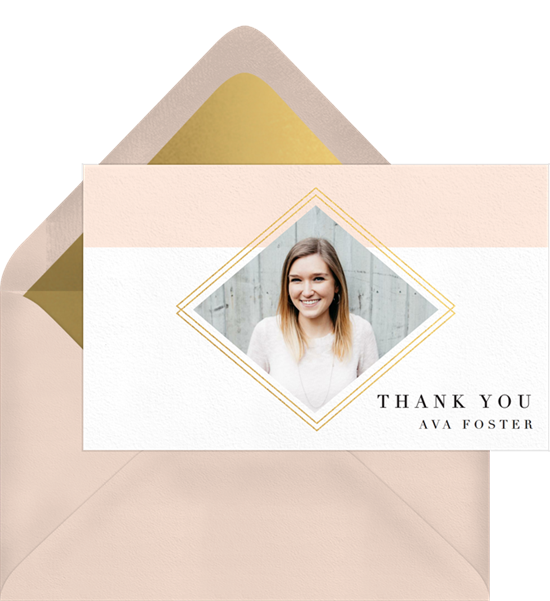 Could this thank you note be any more classy? With a shimmering, white envelope and a stark, navy blue background, it looks just as impressive as you did in your graduation gown (well, almost).
