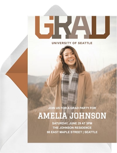 Start by browsing Greenvelopesâ collection of digital invitations, including graduation invitations for every theme you can dream up. Youâll find styles with formal typography, vibrant color palettes, and photo slots to shine a spotlight on the honoree. Each invite is customizable so you can make the stationery truly memorable and unique.
