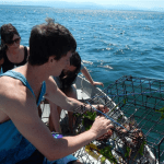 After several hours, the next crew was sent out to check on the cages. Â Michelle pulled up the first cage and was surprised to find a fish! Â Don’t worry, we let the fish go. Â At some point while Noni was pulling up the second cage and the rope seemed to go on forever, Michelle turned to Sam and asked, “Is this a trick rope?” Inside the second cage was our first red rock crab. Score! The third cage was for Preston. Â As Preston started pulling, Sam asked him if it was heavy. Preston’s response was “Either there are a lot of crabs in the basket, or I’m just a wimp.” Â Another minute goes by and Preston says, “Well, I guess I’m a wimp.” Â In the last cage was one big red rock crab who refused to go down without pinching Preston a couple times before Sam broke up the fight.