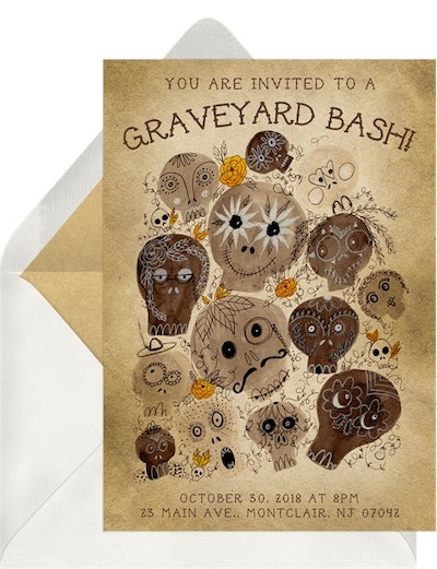 Want to make things really spooky? Plan a Halloween costume party where everyone attends as a skeleton. Make it cute and fun with colorful themes or keep it traditional with black and white Halloween decorations. Use the Graveyard Bash Invitation featuring festive skulls to ask guests to join the celebration.