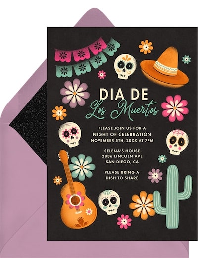 If you want to observe this important celebration, consider traditional dishes like tamales, pozole, sugar skull cookies, and pan de muerto. Use an invite like the Marigolds & Sugar Skulls Invitation with a cheerful and colorful vibe that’s perfect for a familial celebration.Â