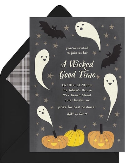 To get folks in the spirit, send out this Spooky Season invitation featuring gliding ghosts, black bats, and pretty pumpkins. The supported backside has plenty of room for adding details on what types of costumes guests should wear to match the party theme.