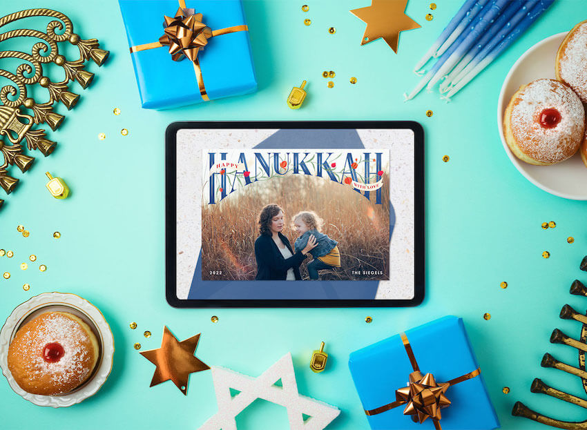 One of our favorite places to share a thoughtful holiday message is inside a Hanukkah greeting card. While you certainly have the option to buy one from the store or go the DIY route, an online card lets you send a personalized greeting while saving time and money. No need to head to the post office, pay for postage, or deal with mailing delays. Plus, no paper waste!