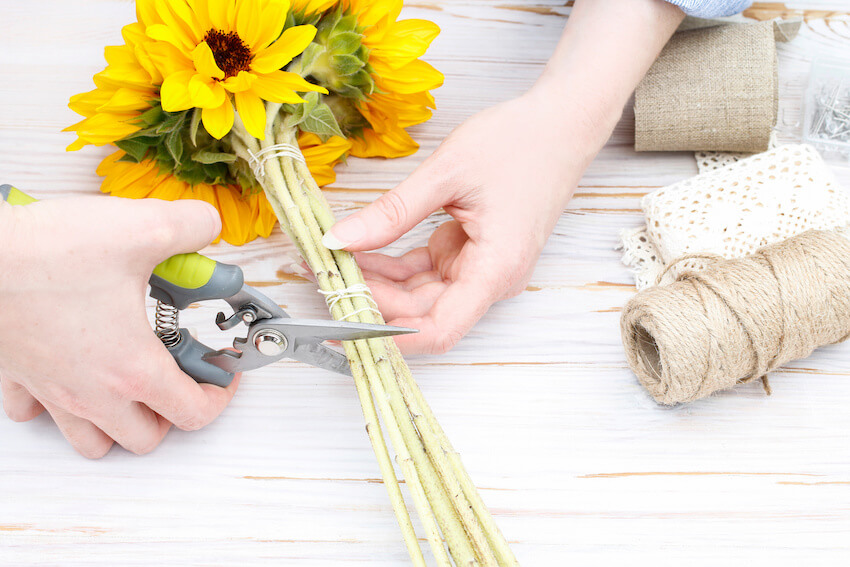 Use tall sunflower stems in clear vases for an elegant look, or place them in quirky, bold-colored vases for a more eclectic feel. Tie them in bouquets for a rustic or boho aesthetic, or spread them across your tables as a garland for a relaxed birthday picnic.