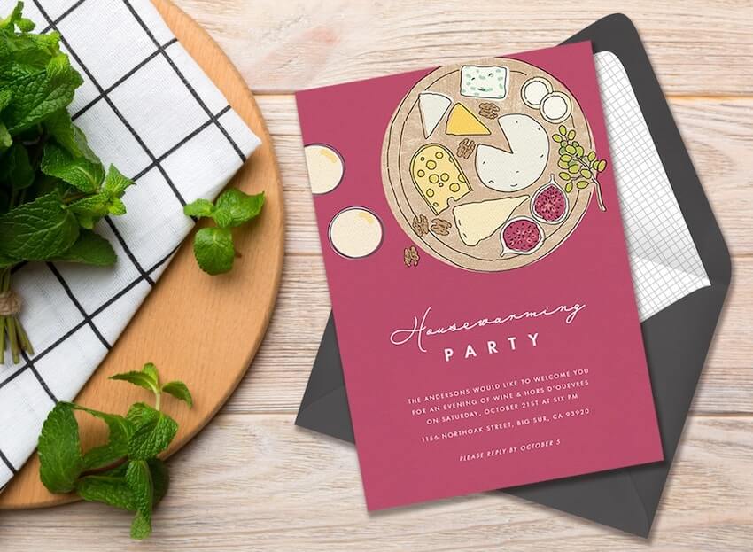 Everyone will want to RSVP âYes!â to your housewarming party when they see this cheeseboard invitation. (Who can say no to cheese?!) Add your new address and email this invite out to your guest list.