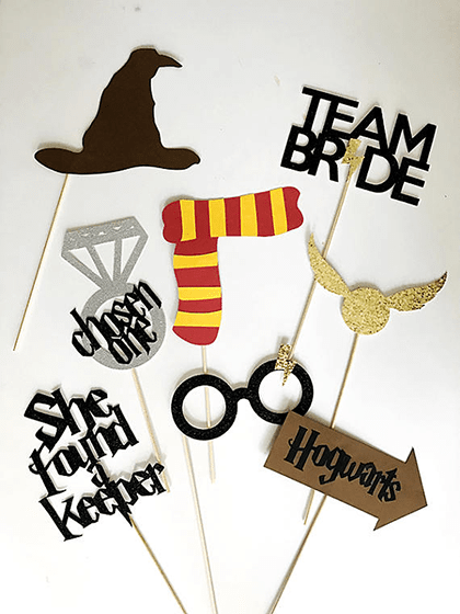 In general, photo booths are a lot of fun at weddings. But they’re arguably more fun with a theme! You can easily rent a photo booth service or create one yourself. Keep your eye out for a festive backdrop (something dark and velvety!) and some fun, Hogwarts-inspired props like these.