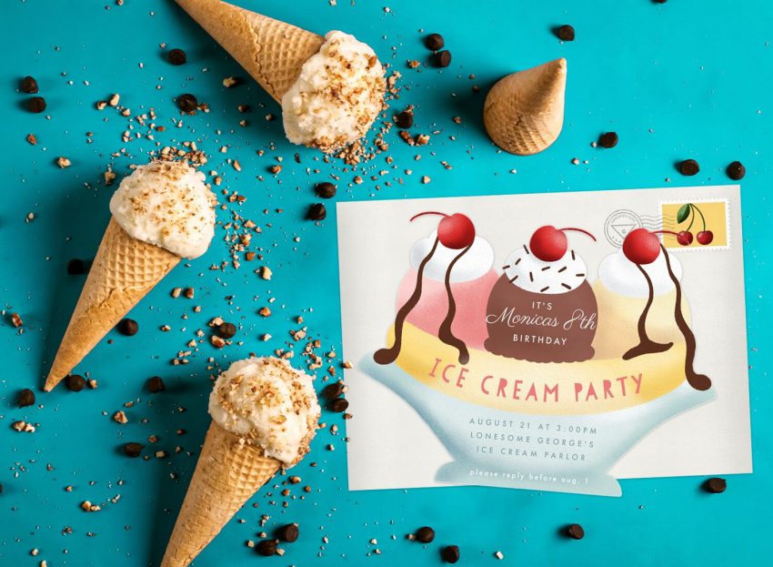 Looking for a party idea that’s cool and sweet at the same time? Well, you can’t go wrong with an ice cream party! Whether you’re planning a birthday party, baby shower, bridal shower, or another sweet celebration, you’ll love this list of ideas that includes everything from decorations and party favors to games, food, and more. Plus, we’ll share some of our favorite ice cream party invitations so you can spread the word in style.Â