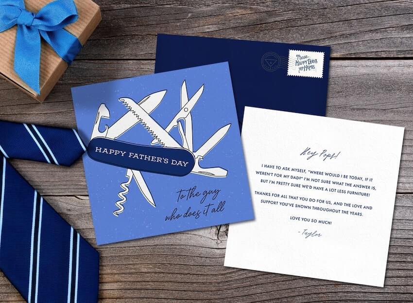 If you’re feeling stuck when figuring out what to write in your Father’s Day card, think of a special moment or reason you bond so well and reference that in your card. For an inspirational card, think about sharing moments where he lifted you up, supported you when you needed it most, or was your rock in a tough situation.