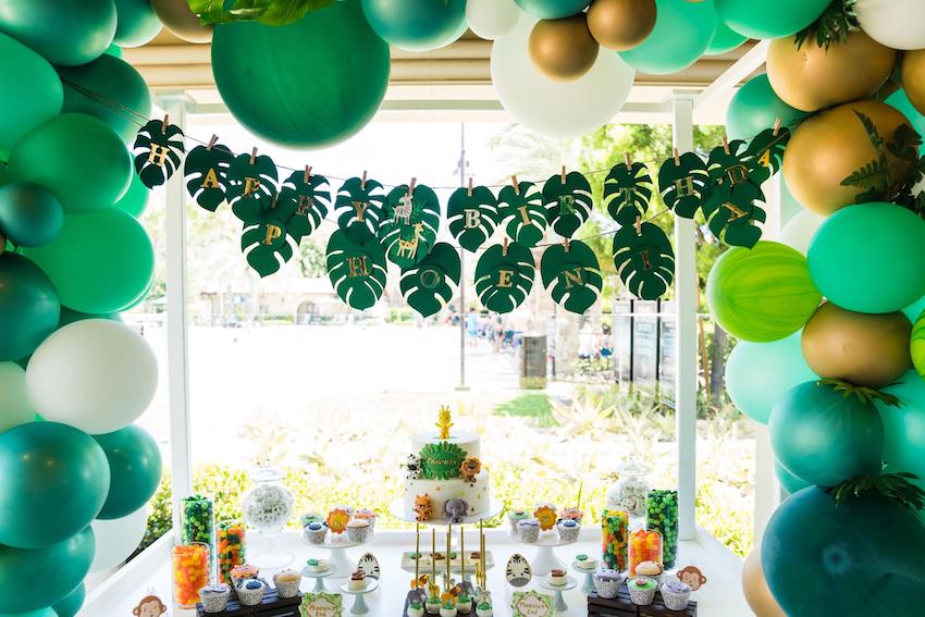 - Balloon decorations: No event is complete (especially a safari theme birthday party) without party balloons! Look for animal balloons featuring tigers, elephants, monkeys, and other wild beasts. You can also opt for zebra stripe or animal print balloons. Display them around the event room, make a DIY balloon garland, and tie a few special latex balloons to the chair for the birthday boy or birthday girl.