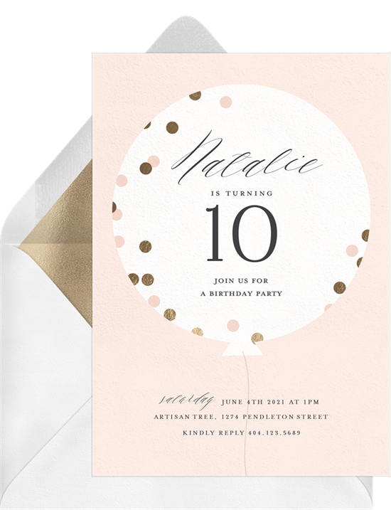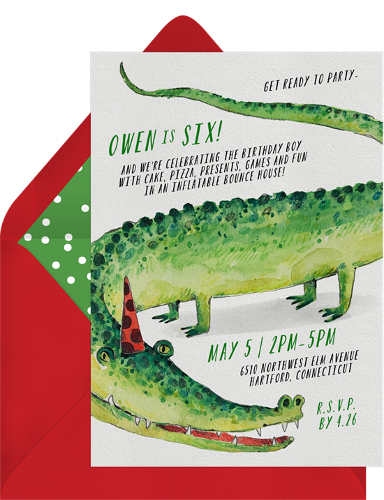 Whether you’re planning a trip to the zoo or the birthday boy (or girl!) simply has a deep love of animals, this birthday card will be a hit. Featuring a watercolor illustration of an alligator and a fun, scribbled font, it’s sure to delight your guests. Customize the invitation wording with, “See you later alligator (at the party!),” and fire off your invites to the other parents.