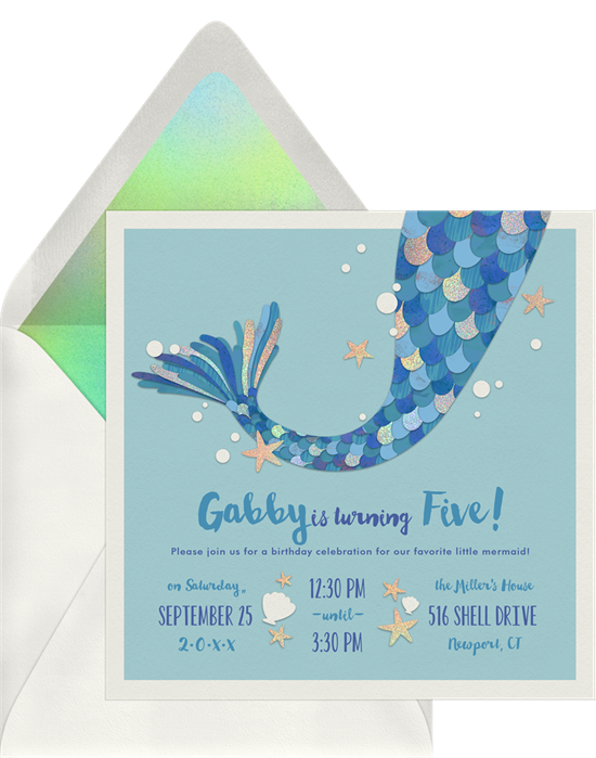 Is a certain water baby about to have a birthday? This mermaid-themed invitation certainly makes a splash, featuring fun illustrations of starfish, clamshells, and a shimmering mermaid fin. Whether you’re planning a pool party or hosting a water fight in your own backyard, this birthday invite is about to make waves.