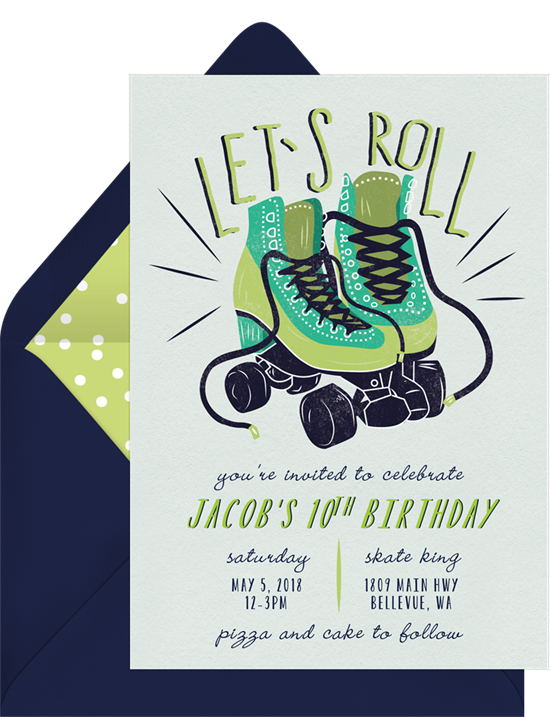 Grab your roller skates (and perhaps a set of knee pads) and get ready for the best birthday party ever. Your little birthday star is headed to the skating rink, and this invitation will ensure they’re joined by all their best pals. Choose from five bright color palettes, or create your own to match your birthday party theme.