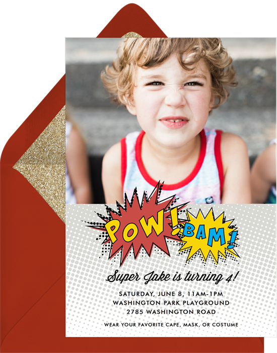 If your little superhero has a birthday coming up, this party photo card will start your celebration off with a POW! and a BAM! Tell your little crime fighter to don their best cape and you’ll take care of inviting all their sidekicks. Luckily, with Greenvelope firing off your invites to all the parents’ inboxes, those RSVPs will come in at the speed of light.