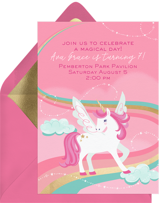 If your little magician could wave their magic wand, what birthday bash would they wish for? This adorable birthday greeting card is exactly what they’ve been dreaming of, with a unicorn illustration, sparkling rainbow, and pink background. Send it out to all your guests as you count down to your little one’s enchanting party.