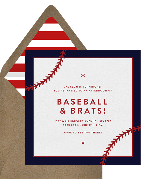 If you’re planning a baseball-themed birthday party, this invitation better be first in the lineup. Whether your little all-star is dreaming of a day out at the ballpark or a game at your own field of dreams (translation: your backyard), this kid’s party invitation is sure to be a home run. Grill some brats, ask the parents to fill the stands, give all the little players eye-black stickers, and prepare for a wonderful afternoon at the ballpark.