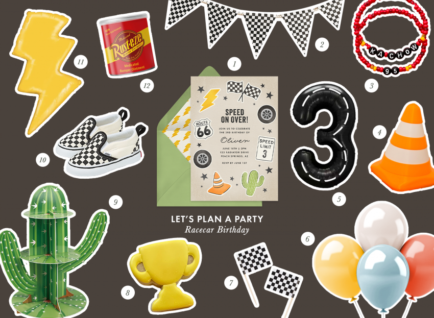 Set the tone before the party even starts with an invitation that gets little guests hyped for race day. Look for designs that play with bold typography, thematic illustrations, checkered borders, and statement colors. If you go for digital invitations, Greenvelope’s designs have fully customizable text, so you can make it completely your own.Β