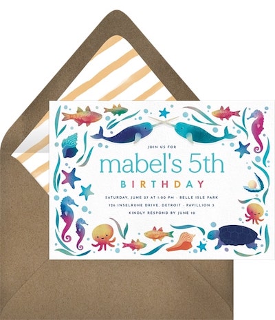This under-the-sea birthday invitation has all the elements you need â from turtles and fish to narwhals and seahorses. Add a personalized message to the supported backside and get guests ready for an enchanting celebration.