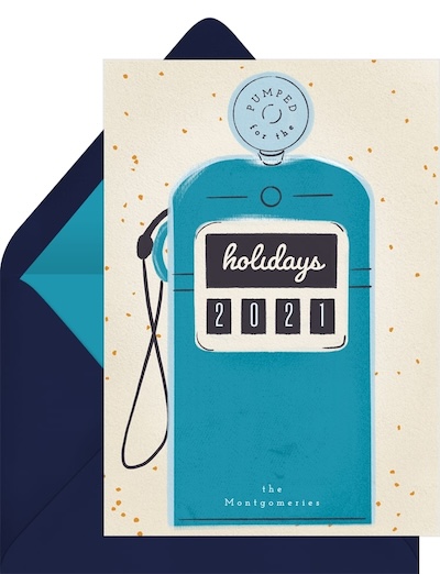 Nobody’s winning the monster truck rally without gas, and this gas pump card is a fun twist on monster truck invitations. Here the design is styled as a holiday card, but it’s easy to change the text on the front and use the space on the back for all your party details.