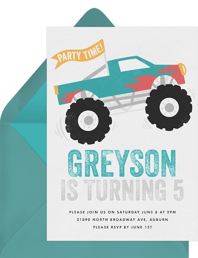Ready to lock in an epic monster truck invitation? Here’s a collection of some of our favorites — whether you want an invite that features trucks, the monster behind the wheel, or other vehicle-related designs.