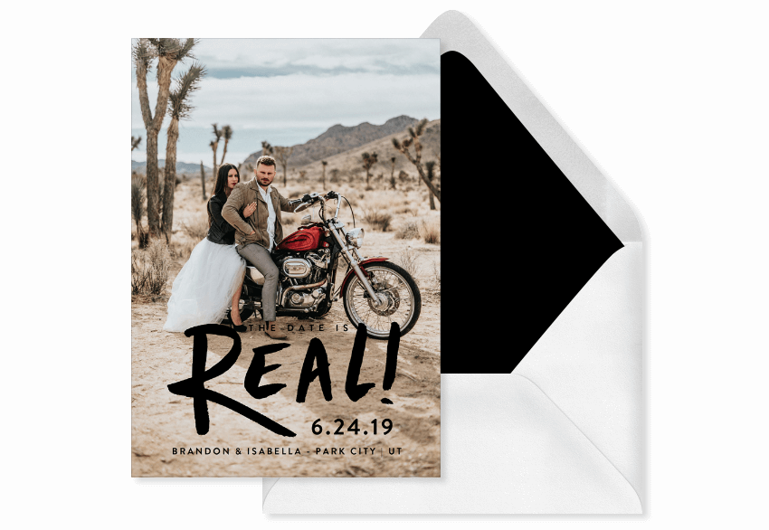 There’s no room for confusion in this full-photo save the date. Playful and fun, this design gets right to the point: the date is real.