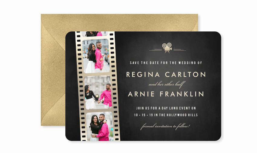 Lights, camera, action! This thematic save the date design is perfect for couples who love a touch of Hollywood glam.