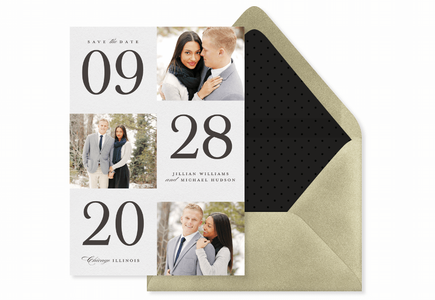 If you ask us, any opportunity to feature multiple engagement photos is a beautiful thing. Complete with bold typography, this save the date design is perfect for modern couples who love a touch of personalization.