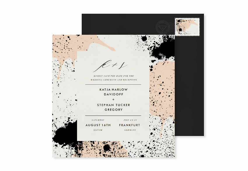 A minimalist design can stand out with striking beauty, like the paint-splatter effect on this modern save the date.