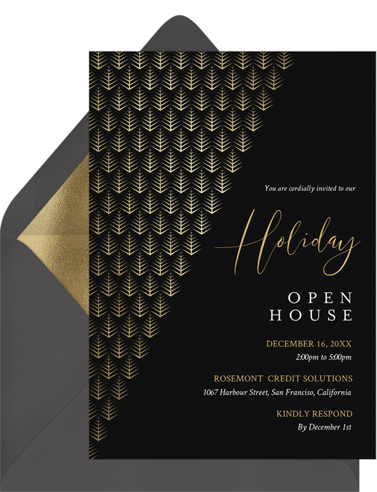You can throw an open house event for a business grand opening, a company holiday party, a housewarming party, or a graduation celebration. Below, you’ll find some of our favorite open house invitation designs that work for all kinds of business or personal events. Plus, we’ll address common open house FAQs and share sample invitation wording.
