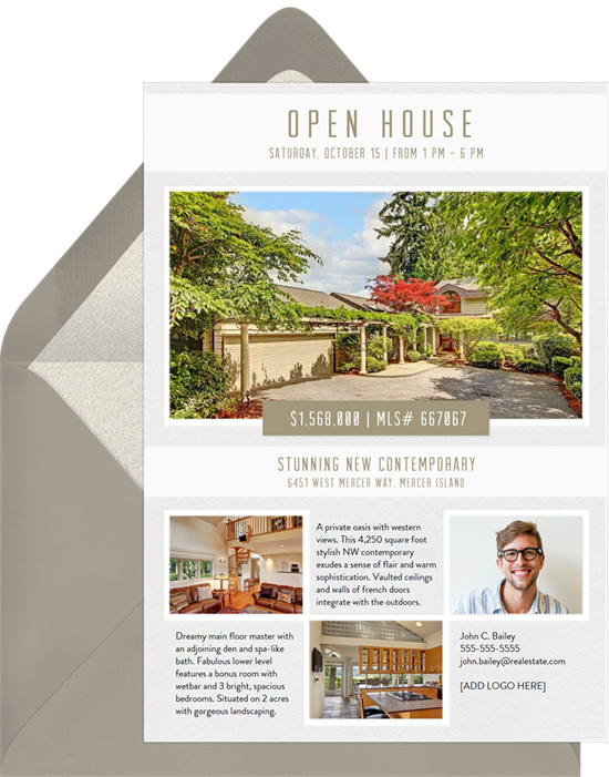 As a Realtor, you’ll love this open house invitation that’s perfect for a real estate open house and ensures you’ll have plenty of house hunters checking out the digs. Customize the invitation with alluring photos from the home’s interior and exterior, and embellish the text with several coveted amenities. There are plenty of people out there looking for their dream home, and you’ll make sure they find it.