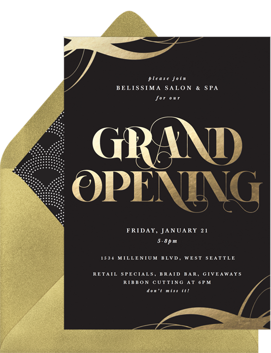 Invite your favorite clients, ride-or-die supporters, and all-time biggest cheerleaders as you open your doors. This luxurious, gold foil business invitation is fit for your show-stopping, mic-dropping launch party.