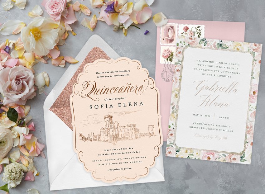 Once you’ve chosen a theme, it’s time to share it with all your invitees by sending out quinceañera invitations. Aim to send these out around eight weeks before your party to give guests plenty of time to save the date.