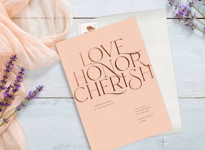 If there’s space on your invites, you could even add your favorite romantic wedding poem — or come up with your own. You can also use our wedding invitation wording tool to find the perfect words.Â