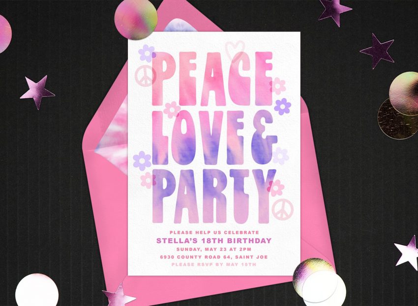 How groovy is this vintage tie dye invitation? Anyone receiving this knows they’re in for a good time with plenty of fun music, party games, and delicious throwback food.