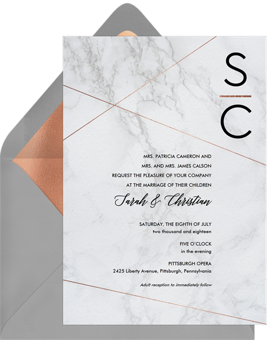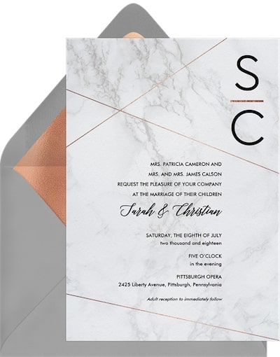 Ever since Alva Vanderbilt built her Marble House in the gilded age, marble has been a sign of decadence and sophistication. And this chic marbled-background invitation is just that. Rose gold foil accents add to the luxurious effect. Choose the corresponding save the date and thank you note designs to keep the theme going.