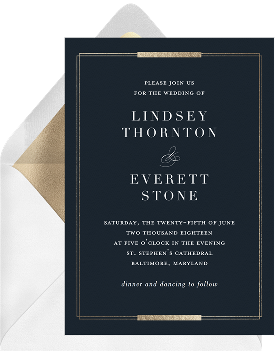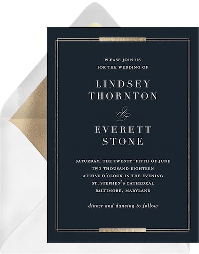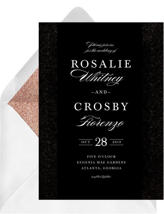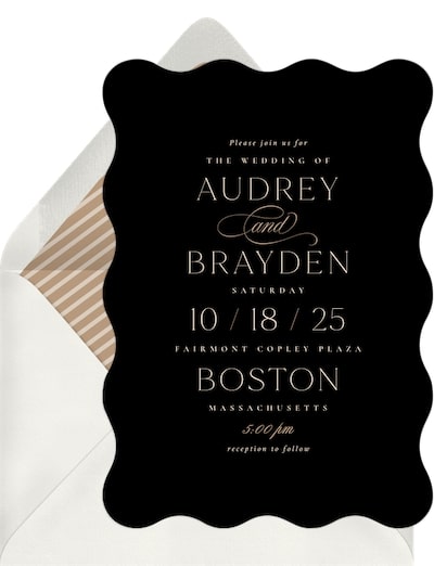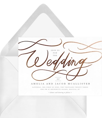 This elegant wedding invitation is all class. Scrolling calligraphy and letterpress style lends itself to a black-tie affair or formal wedding, but you can make this work for any wedding with a minimalist style.