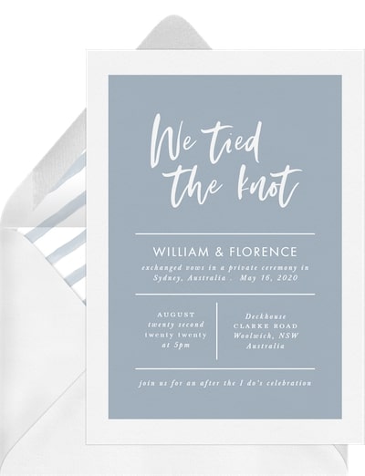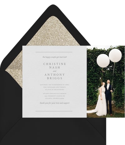 This simple, all-text design can serve an array of purposes. Change the script at the top to “We’re tying the knot” and you have an understated invitation. Or use as-is and send out post-elopement wedding announcements. There’s plenty of room for all your details — personalize to your heart’s desire!