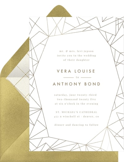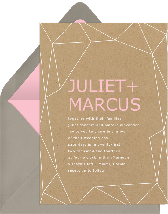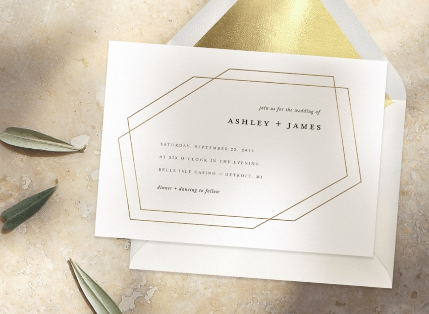 Mix your love for all things geometric with simplicity in this elegant angular wedding invitation. It’s available in a range of different metallic hues, or you can work with our designers to bring your wedding color to the invite instead.