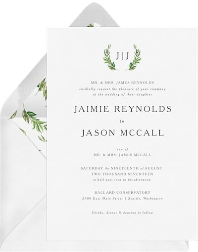 Simple greenery flanks an elegant monogram in this minimal invitation, which has a complementing custom envelope liner. The understated design leaves plenty of room for your details, including reception location and RSVP date.