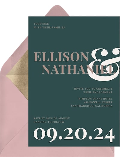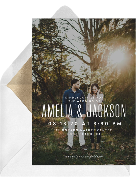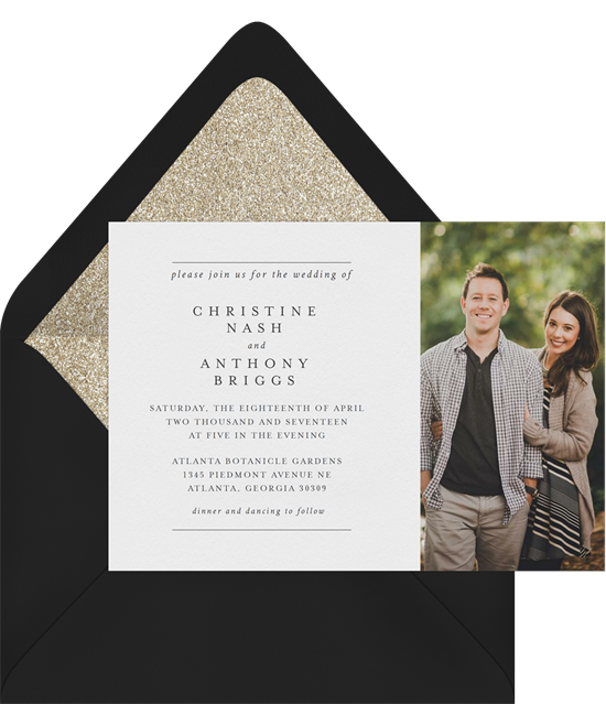 Photo cards are a great way to embrace minimal style while focusing on the guests of honor: you and your soon-to-be spouse. Use professional engagement photos or a favorite snapshot for these simple photo invites. Choose one standout shot or arrange a few favorites in a collage. Guests will love to see your smiling faces.