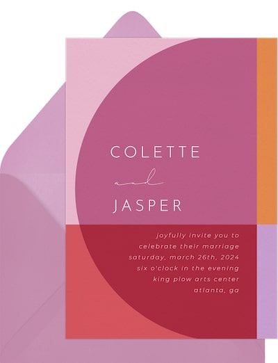 For a more colorful take on the simple wedding invitation theme, try this arc-inspired wedding invitation. We love the contemporary color options and mix of straight lines and big, sweeping circles.