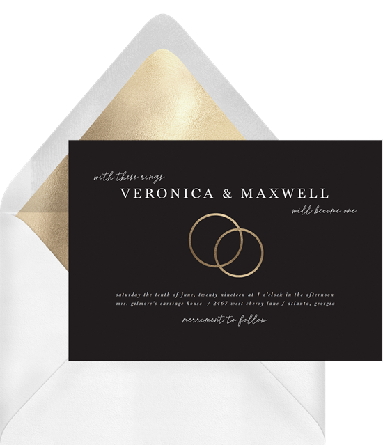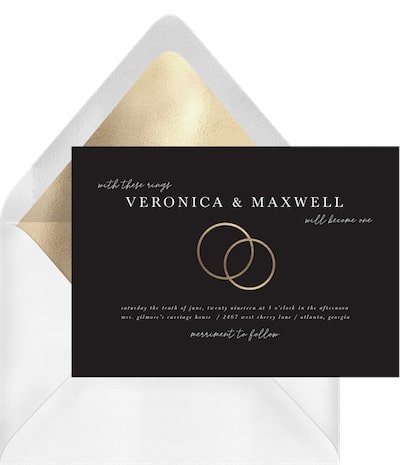 Horizontal orientation lets the type sing in this luxe wedding suite. White type is stylized in a combination of hand script and Helvetica text for a look that is appealing and easy to read against a black background. In the center, simple rings in beautiful gold foil offer tasteful ornamentation.