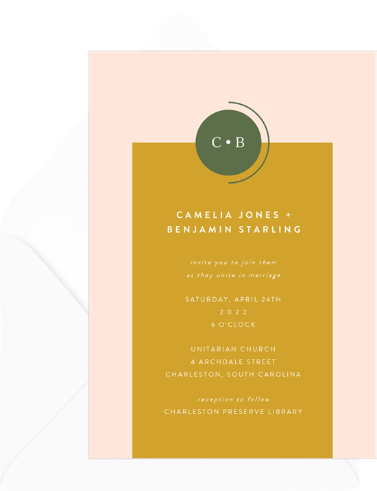 A graphic monogram emblem is front-and-center in this Bauhaus-inspired invitation. Choose from several retro muted color combinations, topped with clean white typography. The geometric style is perfect for a mid-century modern wedding aesthetic.