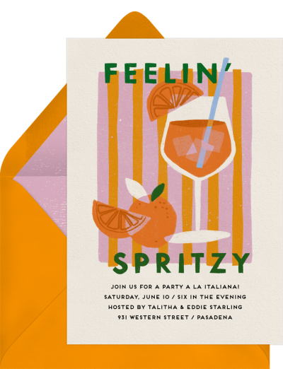 Invite friends to get a little spritzy with this fun, lighthearted design featuring retro illustrations of the classic Aperol Spritz–the unofficial drink of Italy.