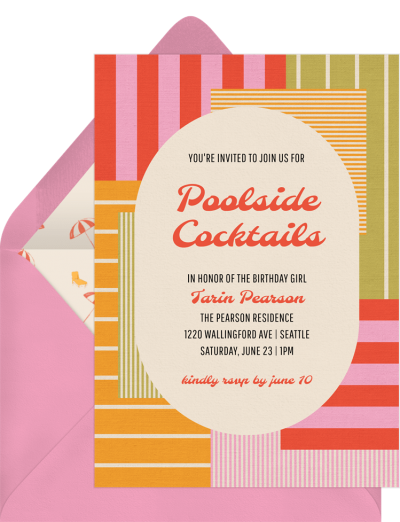 Get guests in the pool party mood with this beach towel-inspired patchwork design featuring a variety of summery color palettes and a funky retro typeface.