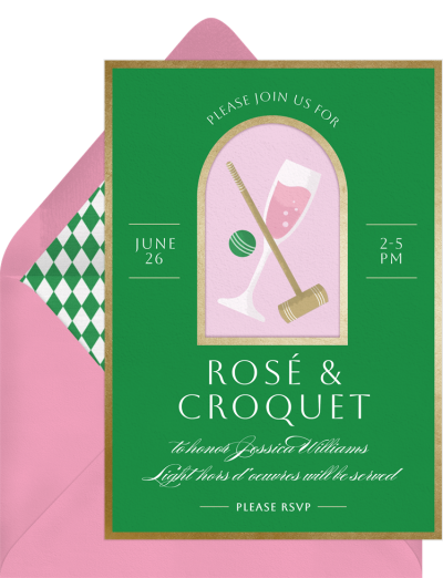 How can one make the classic lawn game of croquet any better? Easy. Just add rosé, and all of your favorite people. This ‘Rosé and Croquet’ design features an elegant arch window (outlined in gold), and whimsical illustrations to match the unique party theme.