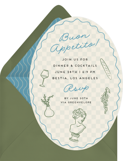 Now serving: a dinner party with a bit of whimsy. This summer dinner party design’s hand-drawn illustrations, wavy border and checkered background (that resembles a tablecloth) signal a playful yet sophisticated gathering.