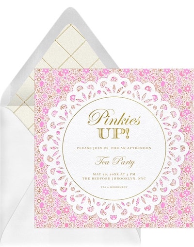 If you’re going for a classic look, doilies are a must-have. These traditional afternoon tea party items are not only practical for placing underneath dessert plates or glasses, but they also work well as decor pieces. Display doilies on the wall to create fun art pieces or use an assortment of them to create a table runner. When it’s time to invite your guests, consider this Dainty Doily invitation.